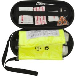 Apteczka samochodowa w pokrowcu, główna przegroda na zamek błyskawiczny, 40 el., w tym: latarka na dynamo, srebrny koc termiczny, płatki dezynfekujące alkoholowe (10 szt.), plastry (15 szt.), chusteczki odświeżające (2 szt.), nożyczki, agrafki (2 szt.), kamizelka bezpieczeństwa, taśma, bandaż (2 szt.), bandaż trójkątny, waciki sterylne (2 x 5 szt.) oraz przezroczysty opatrunek