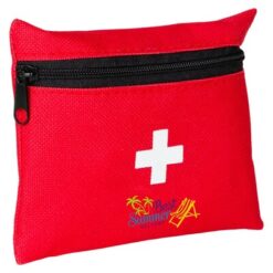 Apteczka w pokrowcu z główną przegrodą na zamek błyskawiczny, zawiera 7 elementów stanowiących wyposażenie apteczki: 10 plastrów, 4 płatki nasączone alkoholem, taśma, 2 nieprzylegające opatrunki, bandaż, patyczki higieniczne (20 szt.) oraz nożyczki, produkt wykonany z poliestru 600D