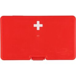 Apteczka, zapięcie na klips, czerwony pojemnik z białym krzyżem, gąbki (2 szt.), opatrunki (5 szt.), gaziki nasączone alkoholem (4 szt.), nożyczki, rolka bandażu (450 cm), taśma (450 cm), produkt wykonany z PP, PE i poliestru