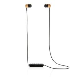 Słuchawki bezprzewodowe BT 5.0, douszne, wykonane z bambusa, magnetyczne końcówki, wbudowany akumulator 55 mAh umożliwia odtwarzanie muzyki do 3 godzin, ponowne naładowanie w 1 godzinę, zasięg do 10 m, nakładki w 3 rozmiarach i ekologiczne etui w komplecie