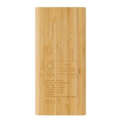 Power bank 8000 mAh, ładowarka bezprzewodowa 5W, 4 diody wskazujące poziom naładowania, obudowa wykonana z bambusa z certyfikatem FSC® (Forest Stewardship Council), wbudowany akumulator litowo-polimerowy klasy A, bezprzewodowe ładowanie jest kompatybilne ze wszystkimi urządzeniami posiadającymi możliwość ładowania indukcyjnego, wejścia micro USB i USB typu C 5V/2A, wyjścia USB i USB typu C 5V/2A, wyjście bezprzewodowe 5V/1A, kabel z TPE z recyklingu bez dodatku PVC w komplecie, w pudełku z certyfikatem FSC® mix, nie zawiera PVC, ślad węglowy produktu: 3,66 kg CO2