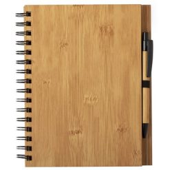 Notatnik bambusowy (ok. A5, 80 kartek w linie), twarda okładka, długopis z bambusowym trzonem w komplecie, wkład długopisu w czarnym kolorze, spiralne bindowanie