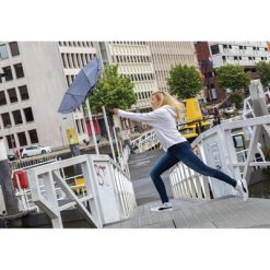 Parasol 21″ sztormowy, automatyczne otwieranie i zamykanie, metalowa rama, żebrowanie z włókna szklanego, bambusowy uchwyt, panele wykonane z 7,5 poddanych recyklingowi butelek PET (500 ml), dzięki zastosowaniu technologii fizycznych znaczników AWARE™ wykorzystane materiały są identyfikowalne z pochodzenia, 2% wpływów z każdego sprzedanego produktu z kolekcji Impact jest przekazywane na rzecz Water.org