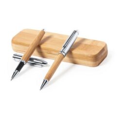 Zestaw piśmienniczy w bambusowym etui, długopis i pióro kulkowe z bambusowym trzonem i srebrnymi elementami