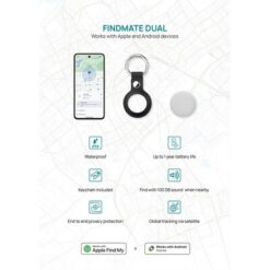 Bezprzewodowy wykrywacz kluczy, lokalizator, wykonany z ABS z recyklingu, kompatybilny ze wszystkimi urządzeniami iOS (aplikacja Apple Find My) oraz z urządzeniami Android (aplikacja Find Hub), wbudowany głośnik umożliwia łatwe znalezienie wykrywacza, czas pracy na jednej baterii wynosi do 1 roku, wymienialna bateria CR2032, wodoodporny IPX5