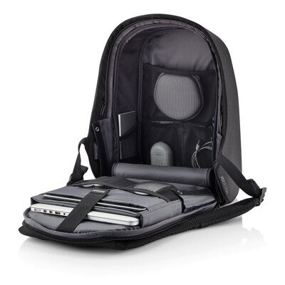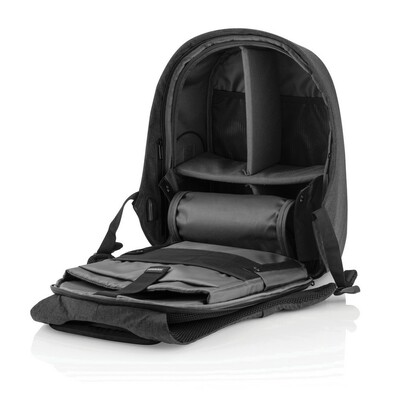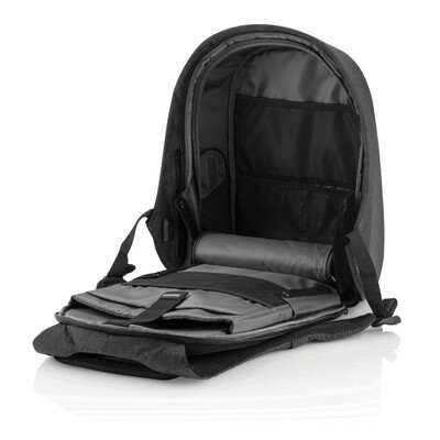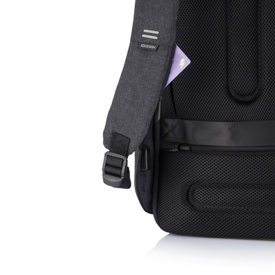 Plecak chroniący przed kieszonkowcami Bobby Hero Regular, wodoodporny i odporny na przecięcia materiał, wykonany z materiału RPET, ukryte zamki i kieszenie, wewnątrz miękkie przegrody na laptopa 15,6″ i tablet do 12,9″, zintegrowany port USB do ładowania telefonów (power-bank nie jest dołączony), odblaskowe paski zwiększające widoczność, pasek do zamocowania na walizce, wzór zastrzeżony®, ślad węglowy produktu: 6,68 kg CO2
