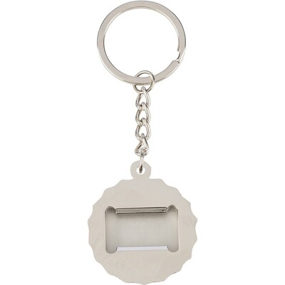 Brelok do kluczy w kształcie kapsla, otwieracz do butelek w kształcie kapsla, zapakowany w papierowy kartonik, produkt wykonany z metalu i bambusa