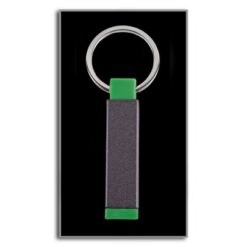 Wąski prostokątny brelok do kluczy, silikonowy z metalową plakietką, w pudełku
