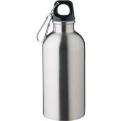 Butelka sportowa 400 ml, ikona recyklingu na produkcie, nie nadaje się do mycia w zmywarce, produkt wykonany ze stali nierdzewnej z recyklingu, nakrętka z PP, srebrny aluminiowy karabińczyk