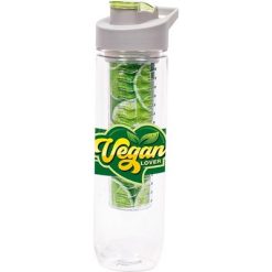 Butelka sportowa 800 ml Air Gifts, posiada pojemnik na lód lub owoce umożliwiający nadanie wodzie smaku według własnych preferencji, szara zakrętka z uchwytem ułatwiającym noszenie i kolorowym zamknięciem, butelka przeznaczona wyłącznie do zimnych i niegazowanych napojów, produkt wykonany z Tritanu i PP