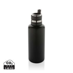 Butelka termiczna 600 ml, składany ustnik w nakrętce, podwójne ścianki z próżnią pomiędzy, utrzymuje temperaturę napojów ciepłych do 5 godzin oraz zimnych do 15 godzin, wykonana z materiałów pochodzących z recyklingu z certyfikatem RSC, całkowita zawartość materiału z recyklingu obliczona w oparciu o wagę całkowitą przedmiotu: 83%, w pudełku z papieru kraftowego z certyfikatem FSC®, nie zawiera BPA, ślad węglowy produktu: 2,49 kg CO2