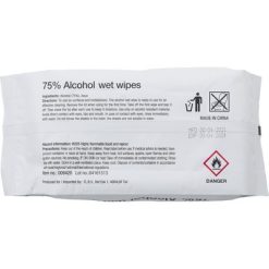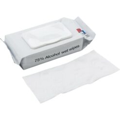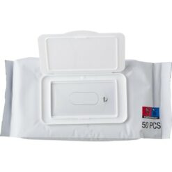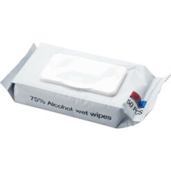 Chusteczki nasączone alkoholem (75%), 50 szt., szczelne opakowanie utrzymuje chusteczki wilgotne, plastikowa pokrywa z miejscem pod znakowanie