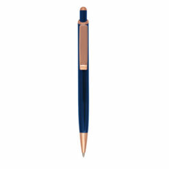 Długopis z kolorowym trzonem i błyszczącymi elementami kolorze różowego złota, wkład w niebieskim kolorze, grawer ukazuje powierzchnię w kolorze złotym, produkt wykonany z aluminium