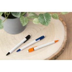 Długopis Stilolinea Baron z wkładem jumbo, biały trzon, kolorowy klips, wkład w niebieskim kolorze, zawiera tusz German Dokumental Ink, produkt wykonany z ABS, plastiku i metalu
