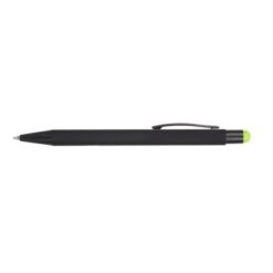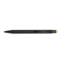 Długopis z czarnym trzonem, posiada gumowe wykończenie, kolorowa końcówka touch pen umożliwiająca obsługę ekranów dotykowych, grawer ukazuje powierzchnię w kolorze zbliżonym do koloru końcówki touch pen lub w kolorze białym, wkład w niebieskim kolorze, produkt wykonany z aluminium