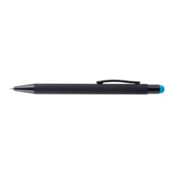 Długopis z czarnym trzonem, posiada gumowe wykończenie, kolorowa końcówka touch pen umożliwiająca obsługę ekranów dotykowych, grawer ukazuje matową powierzchnię w kolorze białym, wkład w niebieskim kolorze, produkt wykonany z aluminium i plastiku