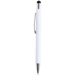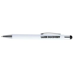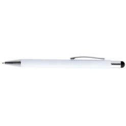 Długopis, touch pen, biały trzon, matowe wykończenie, grawer ukazuje lustrzaną powierzchnię w kolorze zbliżonym do gumowej końcówki