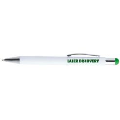 Długopis, touch pen, biały trzon, matowe wykończenie, grawer ukazuje lustrzaną powierzchnię w kolorze zbliżonym do gumowej końcówki