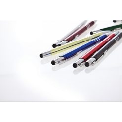 Długopis z kolorowym trzonem o błyszczącym wykończeniu, posiada elementy w kolorze srebrnym, końcówka touch pen umożliwiająca obsługę ekranów dotykowych, wkład w niebieskim kolorze, produkt wykonany z aluminium