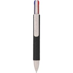 Czterokolorowy długopis, kolory wkładów: niebieski, czarny, czerwony i zielony, długość pisania 300 metrów na każdy kolor, klip ułatwiający zawieszanie na kieszeni albo okładce notatnika, produkt wykonany z kartonu pochodzącego z recyklingu i słomy pszenicznej