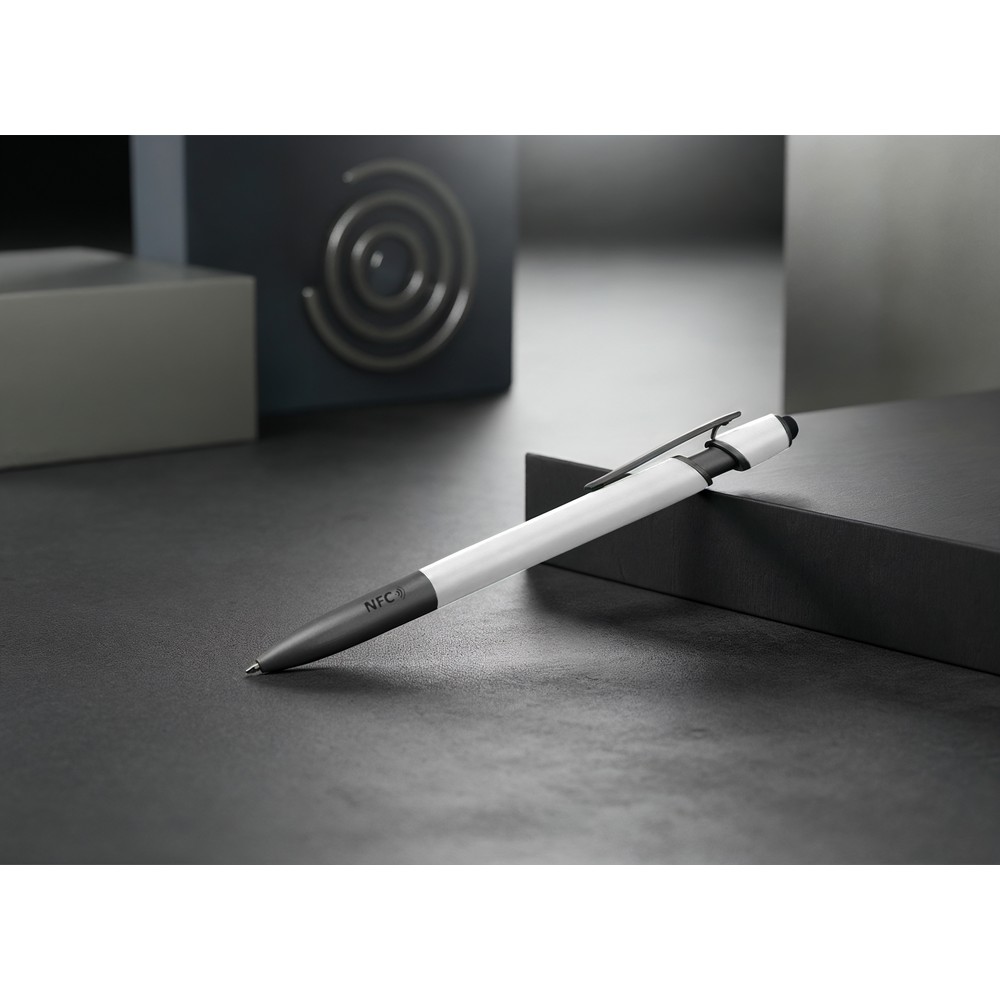 Długopis z chipem NFC (Near Field Communication), działa z urządzeniami posiadającymi technologię NFC, posiada matowy trzon o gumowym wykończeniu i elementy w grafitowym kolorze, końcówka touch pen umożliwia obsługę ekranów dotykowych, wkład w niebieskim kolorze, grawer ukazuje lśniącą powierzchnię. NFC to międzynarodowy standard komunikacji bezprzewodowej wymiany danych na niewielkie odległości. Umieszczony w długopisie chip umożliwia zapisanie na nim np. adresu strony internetowej, który zostanie odczytany przez urządzenie z technologią NFC po zbliżeniu go do logotypu NFC znajdującego się na produkcie. Produkt wykonany z aluminium z recyklingu oraz plastiku.