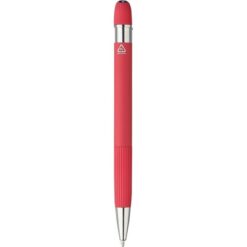 Długopis wykonany z aluminium, gumowe wykończenie, paskowane detale na trzonie i w górnej części, chromowana plastikowa końcówka, przycisk z metalowym klipsem, niebieski tusz, ikona recyklingu na produkcie