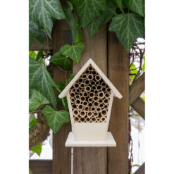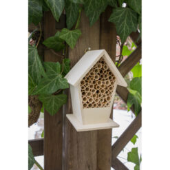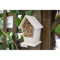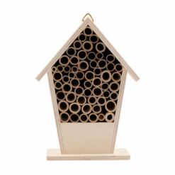 Domek dla owadów z metalowym haczykiem do zawieszenia, produkt wykonany ze sklejki i trzciny