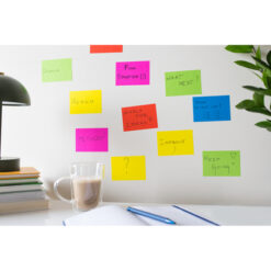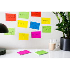Karteczki samoprzylepne, przylegają do powierzchni za pomocą ładunku elektrostatycznego, dzięki czemu nie zostawiają śladów po kleju na powierzchniach, umożliwiają łatwą reorganizację notatek np. podczas szkoleń lub prezentacji, 100 szt., produkt wykonany z papieru oraz folii PP. Wyprodukowany w Europie.