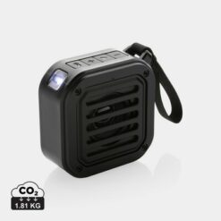 Głośnik bezprzewodowy 3W BT5.3, zintegrowany panel słoneczny do ładowania głośnika o współczynniku konwersji 19%, wbudowany mikrofon, funkcja odbierania połączeń, zintegrowana lampka LED o mocy 30 lm, wbudowany akumulator o pojemności 400 mAh pozwala na odtwarzanie muzyki do 5 godzin, zasięg do 10 m, wykonany z ABS z recyklingu z certyfikatem RCS, całkowita zawartość materiałów z recyklingu obliczona na podstawie wagi całkowitej przedmiotu: 38%, kabel z TPE z recyklingu w komplecie, w pudełku z papieru kraftowego z certyfikatem FSC® mix, ślad węglowy produktu: 1,81 kg CO2