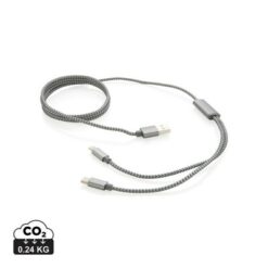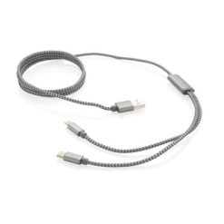 Pleciony kabel do ładowania 3 w 1 z 3 końcówkami: USB, typu C i 2 w 1 (micro USB oraz kompatybilną z urządzeniami iOS), wykonany z plecionego nylonu, długość 120 cm, ślad węglowy produktu: 0,24 kg CO2