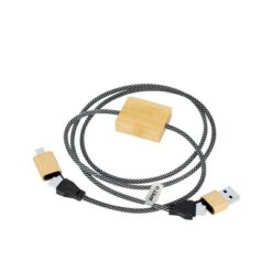 Kabel do ładowania i synchronizacji z 4 końcówkami: 2x USB-C, micro USB oraz kompatybilna z urządzeniami iOS, nadaje się do szybkiego ładowania urządzeń mobilnych do 60W, produkt wykonany z bambusa i poliestru RPET