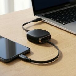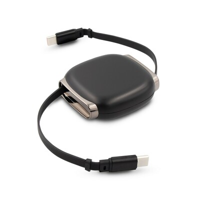 Kabel rozwijany w kwadratowej obudowie, złącze USB-C do USB-C, funkcja ładowania i transmisji danych, kompaktowa forma, napięcie i natężenie ładowania: DC 5V/9V/12V/15V/20V 5A max, 100 W max, średnia prędkość transmisji danych: 35 MB/s, regulowana długość kabla, max 1m