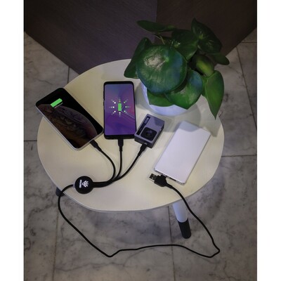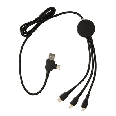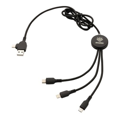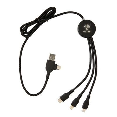 Kabel do ładowania, końcówki: USB, 2 x USB C, micro USB oraz kompatybilna z urządzeniami iOS, grawer ukazuje podświetlaną powierzchnię, obudowa z ABS, długość 120 cm, nie zawiera PVC, ślad węglowy produktu: 0,34 kg CO2