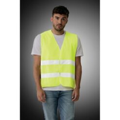 Kamizelka odblaskowa, wykonana z PET z recyklingu, całkowita zawartość materiałów obliczona na podstawie wagi całkowitej przedmiotu: 76%, zgodna z normami EN ISO 20471:2013+A1:2016, UE 2016/425/UE, ślad węglowy produktu: 0,98 kg CO2