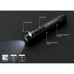 Latarka 3W o bardzo jasnym świetle, wodoodporna IP4, wiązka 100 lumenów sięgająca do 100 m, wysokiej jakości żarówka z 5 trybami świecenia, w tym SOS, wbudowany akumulator 500 mAh pozwala na około 4 godziny ciągłego świecenia, ładowana za pomocą USB, wykonana z aluminium z recyklingu z certyfikatem RCS, całkowita zawartość materiałów z recyklingu obliczona w oparciu o wagę całkowitą przedmiotu: 20%, ślad węglowy produktu: 1,22 kg CO2