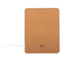 Korkowa podkładka pod mysz, bezprzewodowa ładowarka 5W, działa z urządzeniami posiadającymi możliwość ładowania indukcyjnego, może pełnić funkcję stojaka na telefon, antypoślizgowy spód, wejście USB-C 5V/1A, kabel USB-C w komplecie