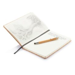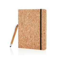 Notatnik A5 (80 kartek 80 g/m2 w linie), wykonany z naturalnego korka, czarna tasiemka zakładkowa, elastyczna opaska do zamykania, bambusowy długopis, touch pen, ślad węglowy produktu: 0,68 kg CO2