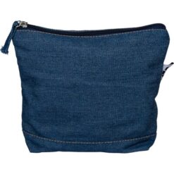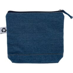 Kosmetyczka, kieszeń zapinana na zamek, ikona recyklingu na metce, produkt wykonany z denimu z recyklingu
