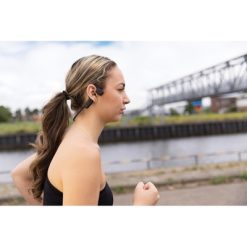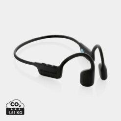 Kostne słuchawki bezprzewodowe, wodoodporne IPX4 (całkowita ochrona przed spryskiwaniem i zachlapaniem wodą z różnych kierunków z natężeniem do 10 litrów na minutę), wbudowany mikrofon, funkcja odbierania połączeń, wykonane z ABS z recyklingu z certyfikatem RCS, całkowita zawartość materiałów z recyklingu obliczona na podstawie wagi całkowitej przedmiotu: 17%, dzięki unikalnej, otwartej konstrukcji słuchawek nie umieszcza się w uchu, a dźwięk jest przekazywany za pomocą wibracji, do 10 godzin na jednym ładowaniu, opakowanie o zmniejszonej zawartości plastiku, nie zawiera PVC, ślad węglowy produktu: 1,51 kg CO2