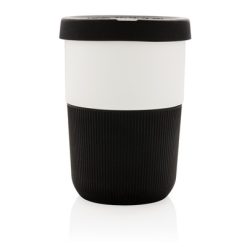 Kubek podróżny 380 ml, wykonany z PLA, silikonowe wieczko i uchwyt, nie zawiera melaminy, ślad węglowy produktu: 0,89 kg CO2