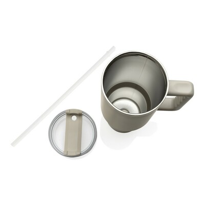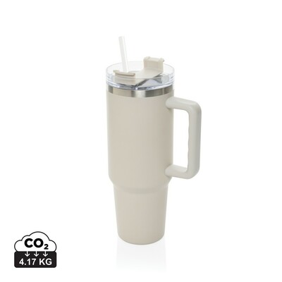 Kubek termiczny 1200 ml, podwójne ścianki z próżnią pomiędzy dzięki czemu kubek posiada funkcję termosu, posiada słomkę i szeroki otwór do picia, wykonany z materiałów z recyklingu, całkowita zawartość materiałów z recyklingu obliczona na podstawie wagi całkowitej produktu: 29%