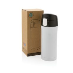 Kubek termiczny 300 ml, podwójne ścianki ze stali nierdzewnej z próżnią pomiędzy, obsługa jedną ręką, wykonany z materiałów pochodzących z recyklingu z certyfikatem RCS, całkowita zawartość materiałów z recyklingu obliczona na podstawie wagi całkowitej przedmiotu: 71%, w pudełku z papieru kraftowego z certyfikatem FSC®, utrzymuje temperaturę napojów gorących do 20 godzin oraz zimnych do 15 godzin