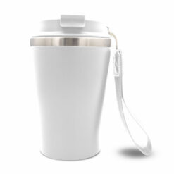 Kubek termiczny 350 ml, posiada podwójne ścianki ze stali nierdzewnej z recyklingu i plastiku, pasek ułatwiający noszenie lub przypięcie, produkt wykonany ze stali nierdzewnej z recyklingu i PP, utrzymuje temperaturę napojów gorących do 4 godzin +leakproof