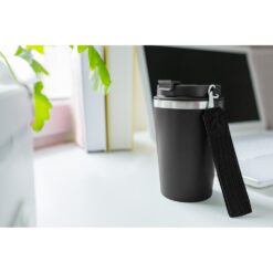 Kubek termiczny 350 ml, posiada podwójne ścianki ze stali nierdzewnej z recyklingu i plastiku, pasek ułatwiający noszenie lub przypięcie, produkt wykonany ze stali nierdzewnej z recyklingu i PP, utrzymuje temperaturę napojów gorących do 4 godzin +leakproof