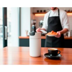 Kubek termiczny 400 ml Air Gifts, posiada podwójne ścianki ze stali nierdzewnej i ceramiki z próżnią między ściankami, co spowalnia oddawanie temperatury na zewnątrz, zachowując funkcje termosu, plastikowe wieczko z zamknięciem umożliwiającym obsługę jedną ręką, matowe wykończenie, produkt wykonany z metalu, ceramiki i plastiku, utrzymuje temperaturę napojów gorących do 10 godzin +leakproof