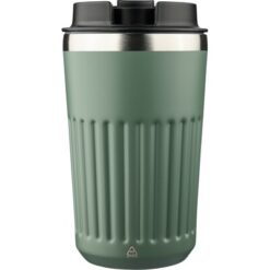 Kubek termiczny 400 ml, posiada podwójne ścianki ze stali nierdzewnej z próżnią między ściankami, co spowalnia oddawanie temperatury na zewnątrz, zachowując funkcje termosu, ikona recyklingu na produkcie, zapakowany w brązowy kartonik, produkt wykonany ze stali nierdzewnej (304 w środku i 201 na zewnątrz), silikonu i PP