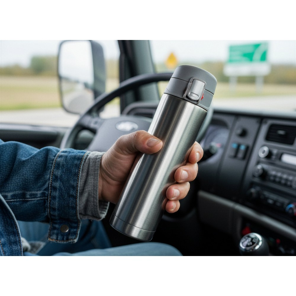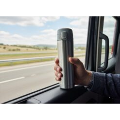 Kubek termiczny 450 ml z podwójnymi ściankami ze stali nierdzewnej z izolacją próżniową spowalniającą oddawanie temperatury na zewnątrz i zachowującą właściwości termosu, wyposażony w płaskie wieczko typu lock z wygodnym mechanizmem otwierania jedną ręką, szczelna konstrukcja leakproof. Utrzymuje temperaturę napojów gorących do 20 godzin