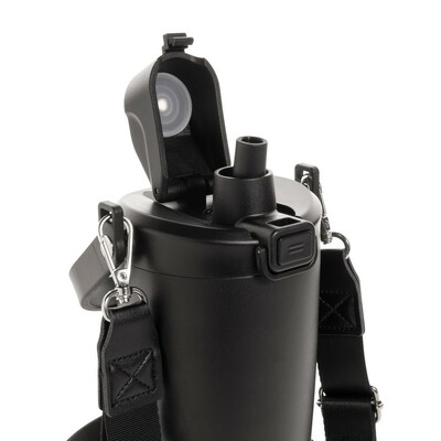 Kubek termiczny 600 ml, posiada ustnik, słomkę oraz pasek do noszenia, nie wymaga obsługi oburącz, podwójne ścianki ze stali nierdzewnej z próżnią pomiędzy, wykonany ze stali nierdzewnej z recyklingu z certyfikatem RCS