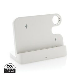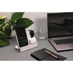 Ładowarka bezprzewodowa 2 w 1 15W, składana, stojak na telefon, wykonana z ABS z recyklingu, ładowarka bezprzewodowa 15W, ładowarka bezprzewodowa 5W do słuchawek i drobnych akcesoriów, posiada gniazdo na kabel do ładowania smartwatcha iOS, wyjścia USB i USB typu C do ładowania za pomocą kabla, działa z telefonami posiadającymi możliwość ładowania indukcyjnego, kabel 120 cm z TPE z recyklingu w komplecie, w pudełku z certyfikatem FSC® mix