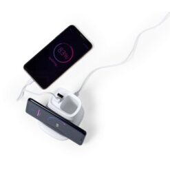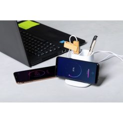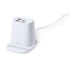 Ładowarka bezprzewodowa 5W, hub USB, pojemnik na przybory do pisania, stojak na telefon z nadrukiem Twojego logo, materiał: plastik, kolor: biały
